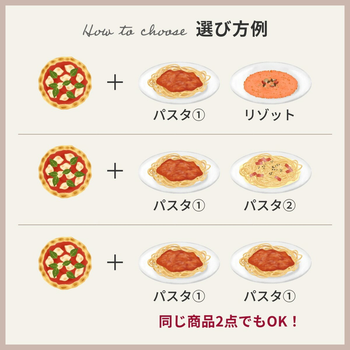 印の中から二つお選びいただきますピッツァは手伸ばしして焼いているため、大きさは商品によって多少の誤差がある場合がございます。